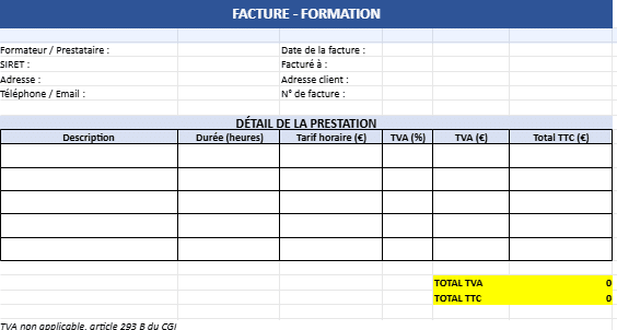 • Description de la prestation (“Formation [intitulé] – [durée] heures”),